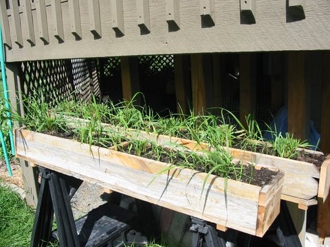 In summer, we put the sweetgrass planters up on sawhorses or stands we built, because the first year we had trouble with grasshoppers at ground level. Somehow putting them up on stands made them safe from the hoppers. Also the blood meal or bone meal is very attractive to the dogs, and they would dig up the planters, ruining the sweetgrass.
